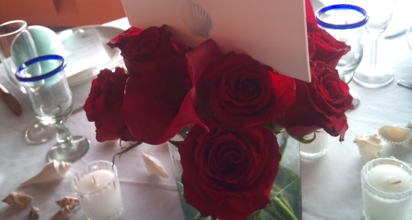 - Montaje en mesas redondas de 8 personas y centros de mesa con flores tropicales.